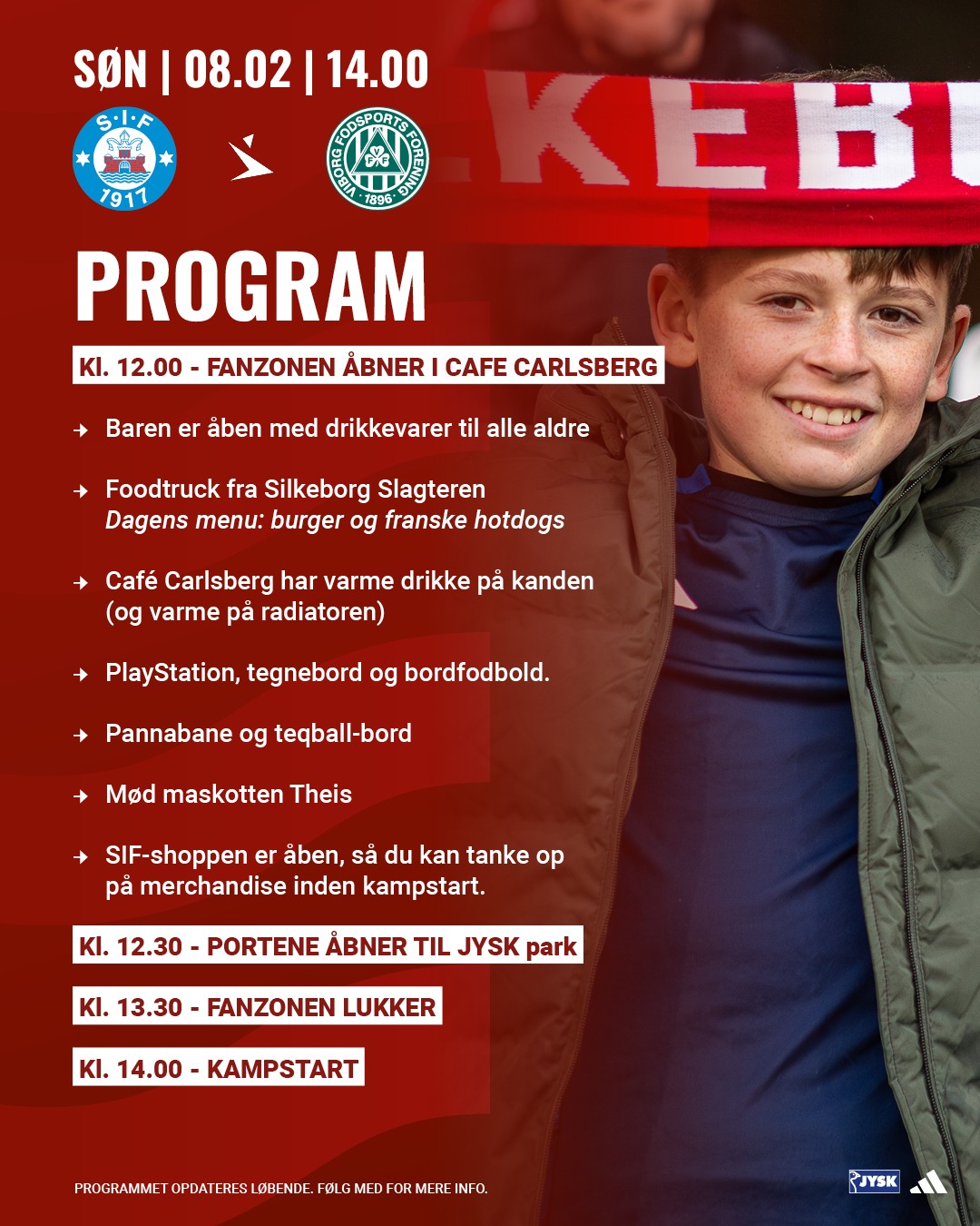 Søndag kl. 14.00 tager vi imod Viborg FF hjemme på JYSK park. Kom i god tid til forårsåbneren og varm op i fanzonen – hvor du bl.a. kan få varmen med varme drikke i Café Carlsberg og en burger fra Silkeborg Slagteren.