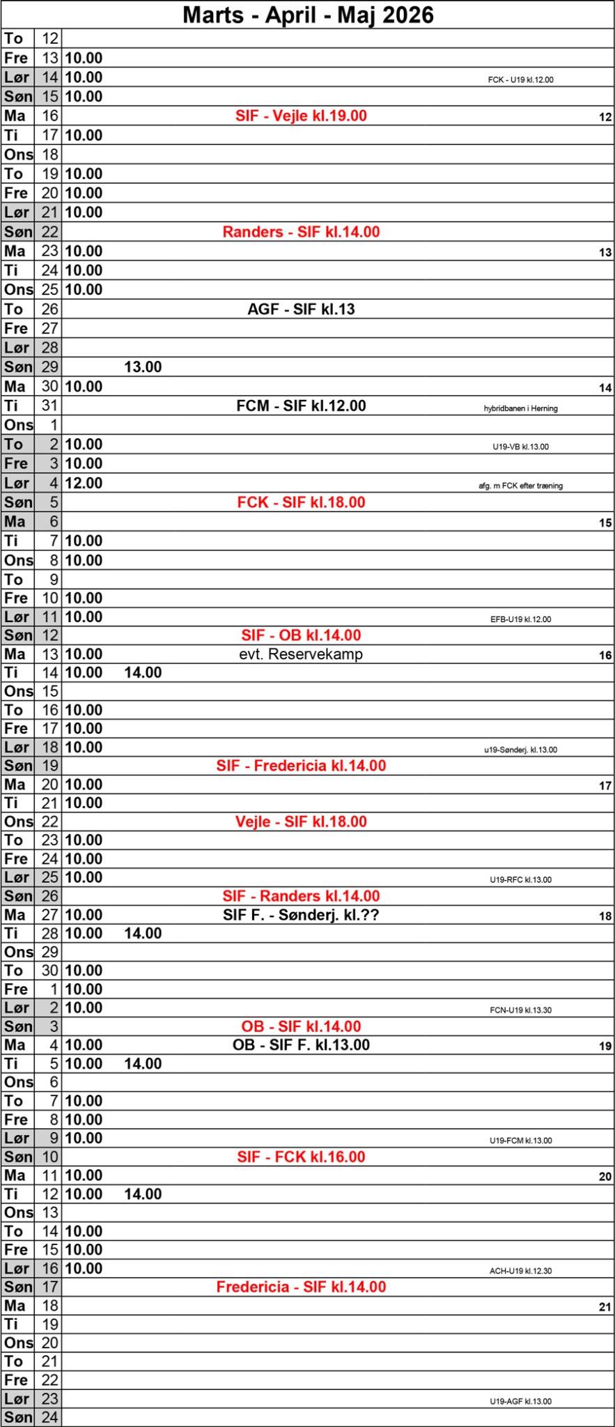 Nedenfor ser du førsteholdstruppens træningsplan. Der kan komme ændringer løbende, men vi bestræber os på jævnligt at opdatere den.